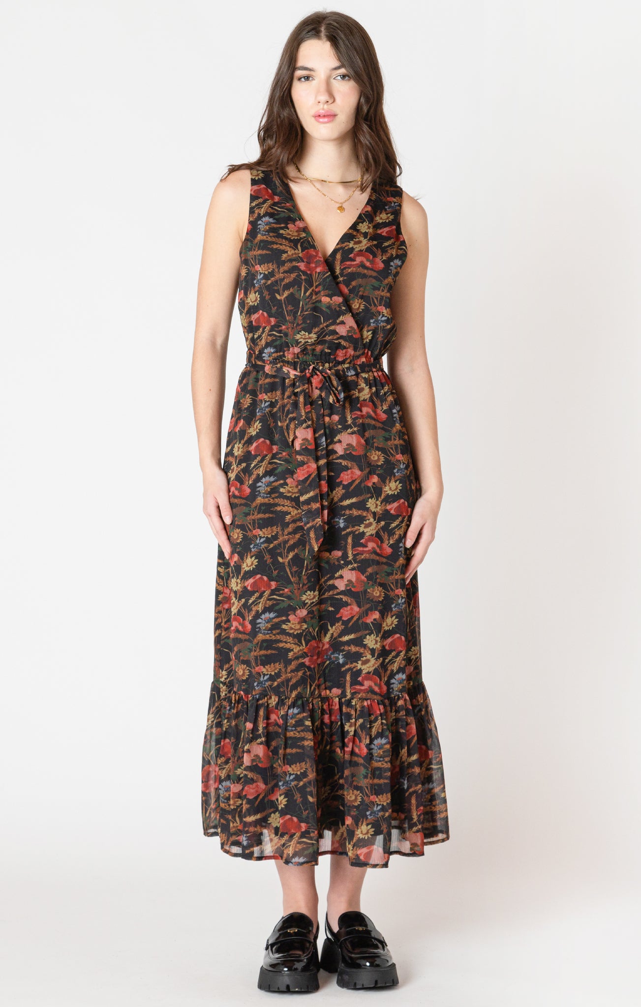 A long sleeveless fall floral dress