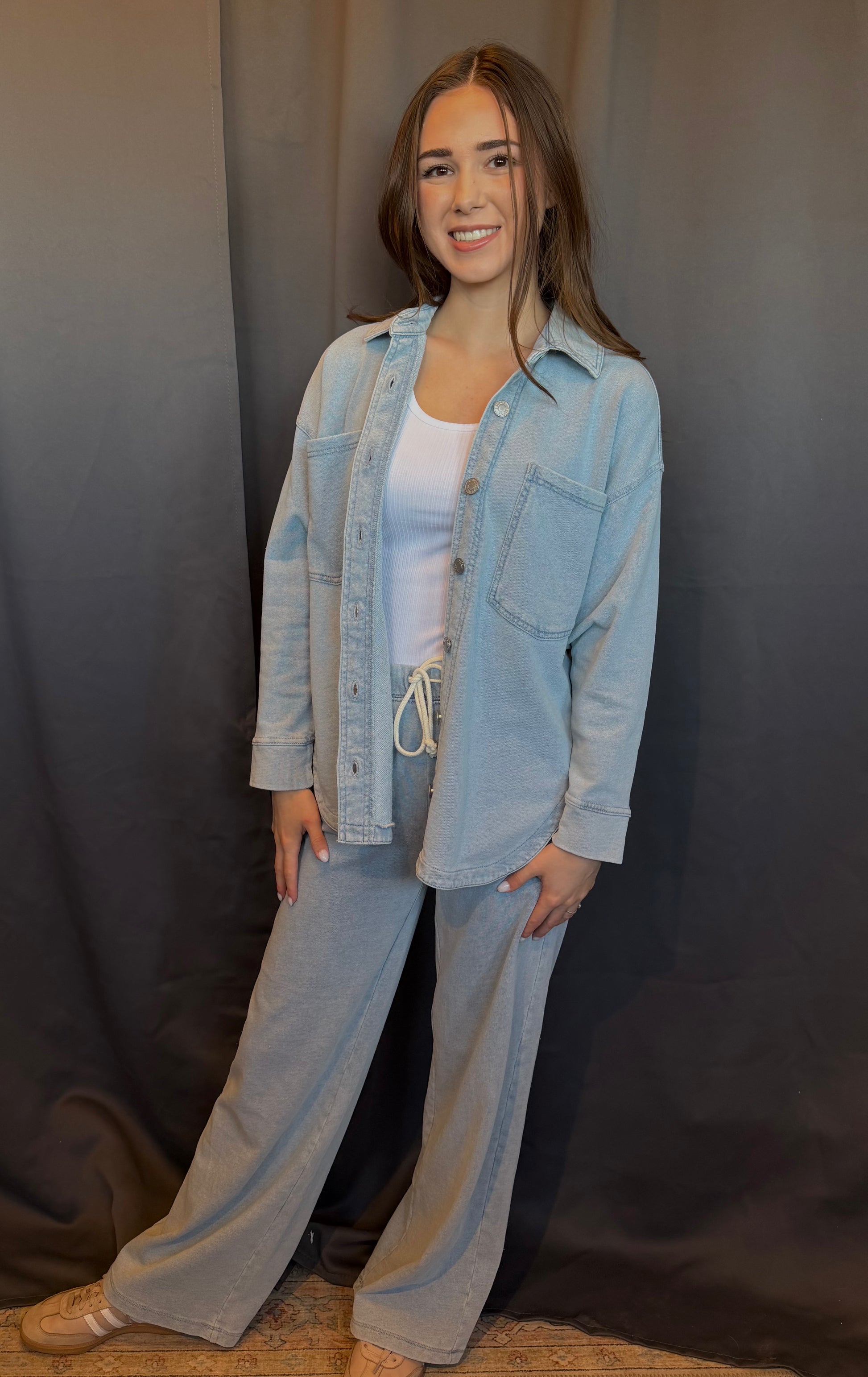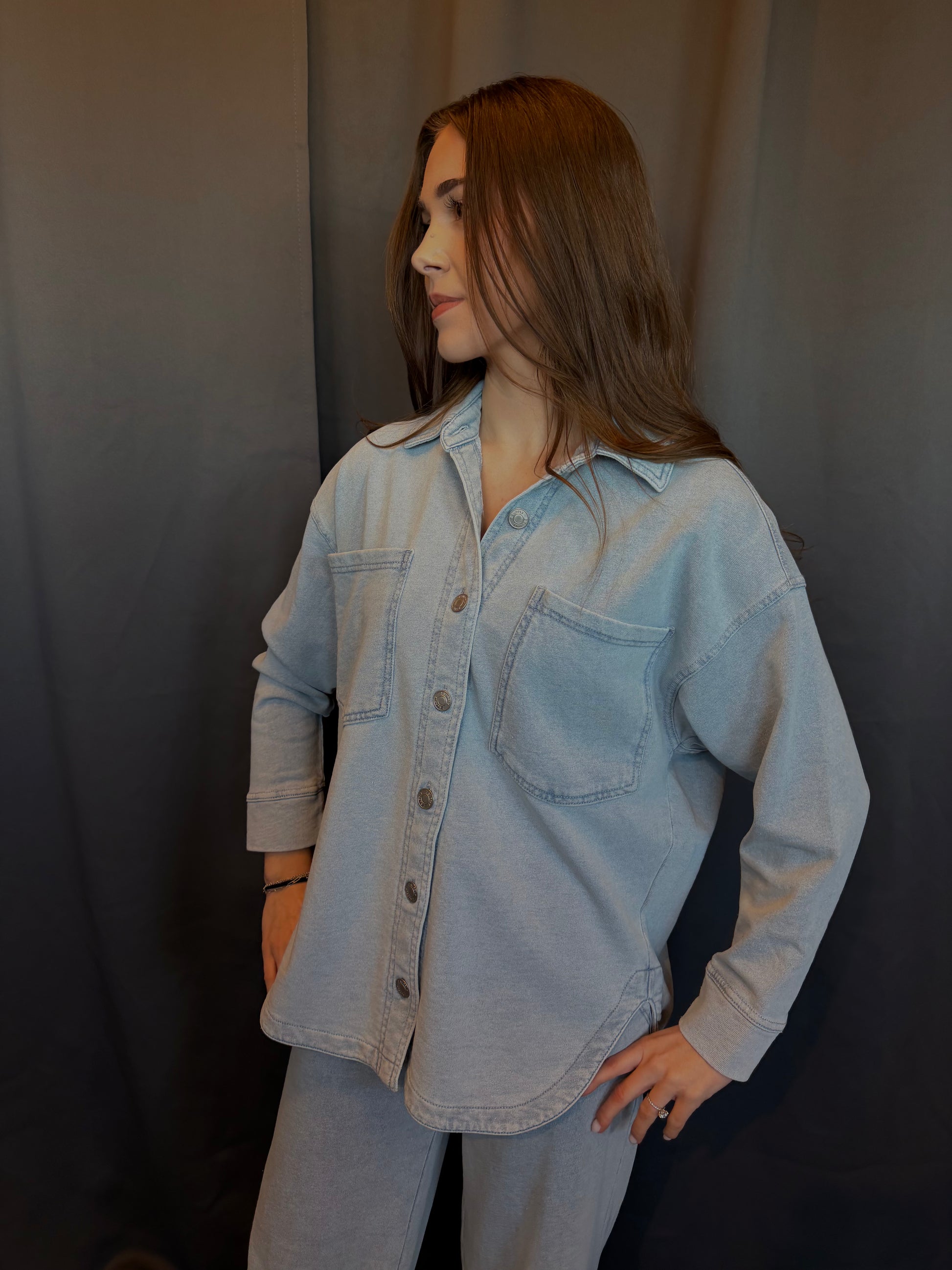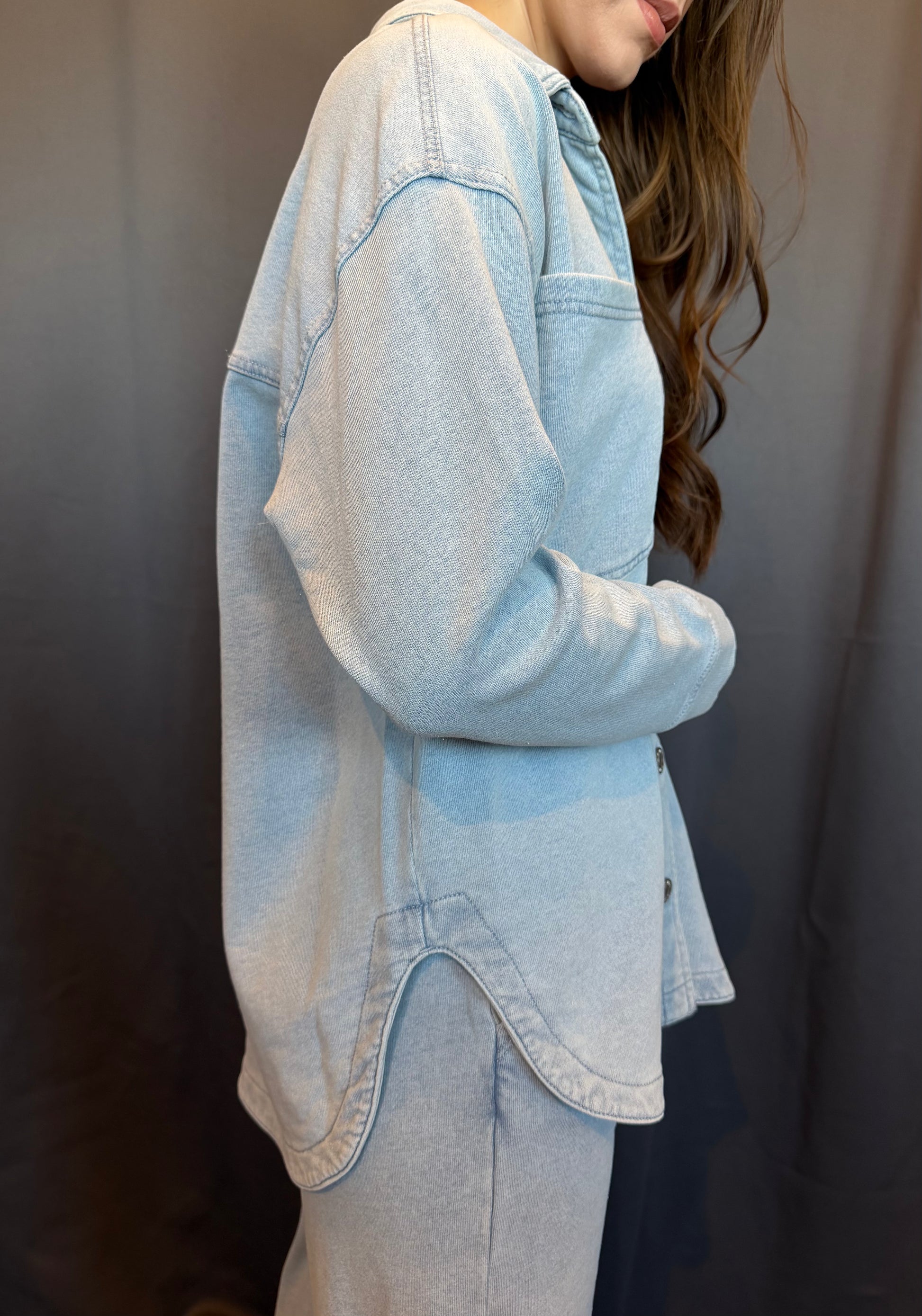 Z Supply's best seller- All Day Jacket especially in knit denim french terry fabric. This relaxed shirt jacket can be worn open or buttoned for a versatile layer you'll want to live in all year.