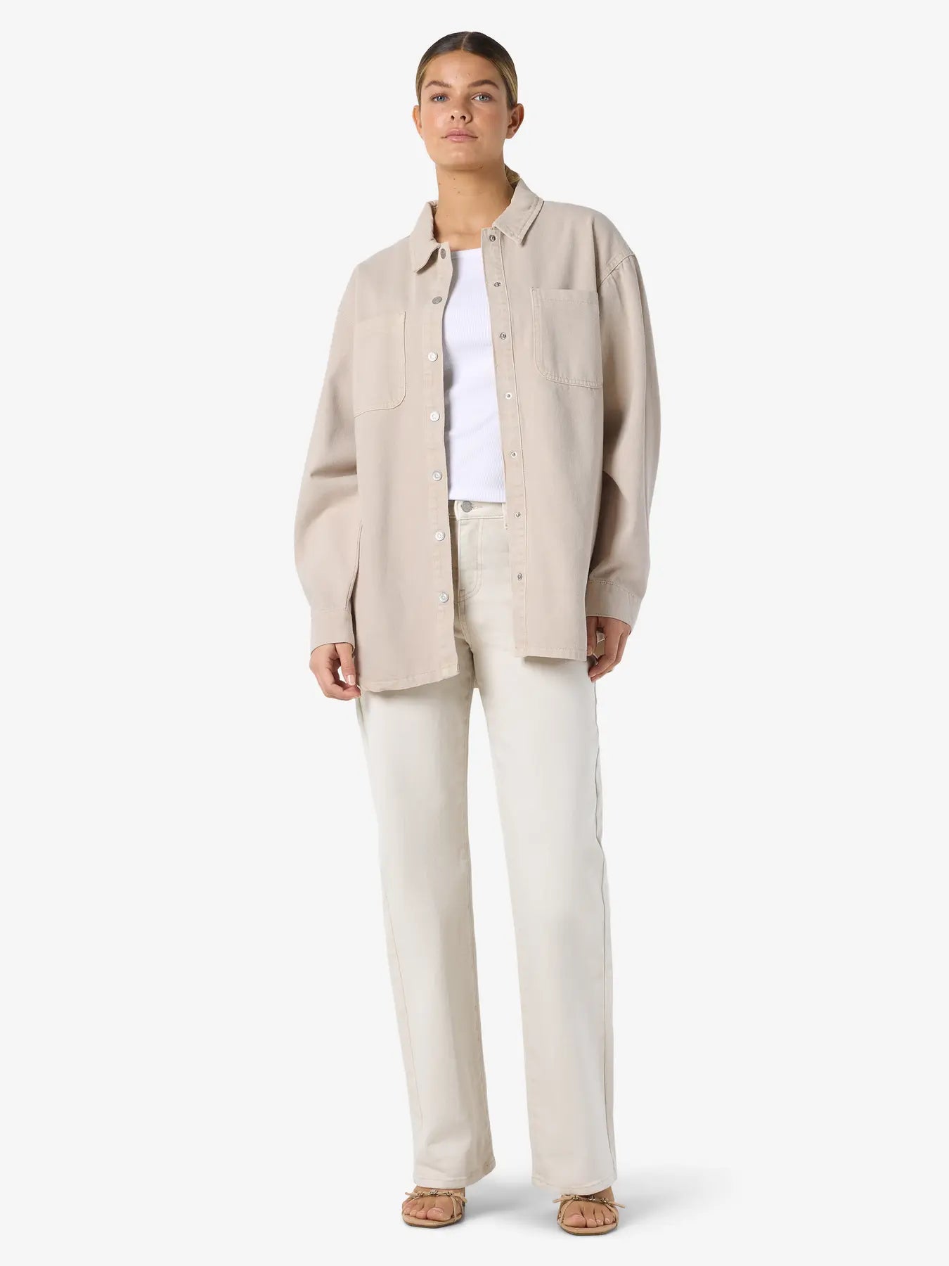 Introducing the Alva Denim Shirt by Noisy May in stone! We love a versatile denim shirt jacket featuring a collar, long sleeves with button snap fastening, and convenient front pockets. Experience the stylish and practical design that will elevate your wardrobe today!
