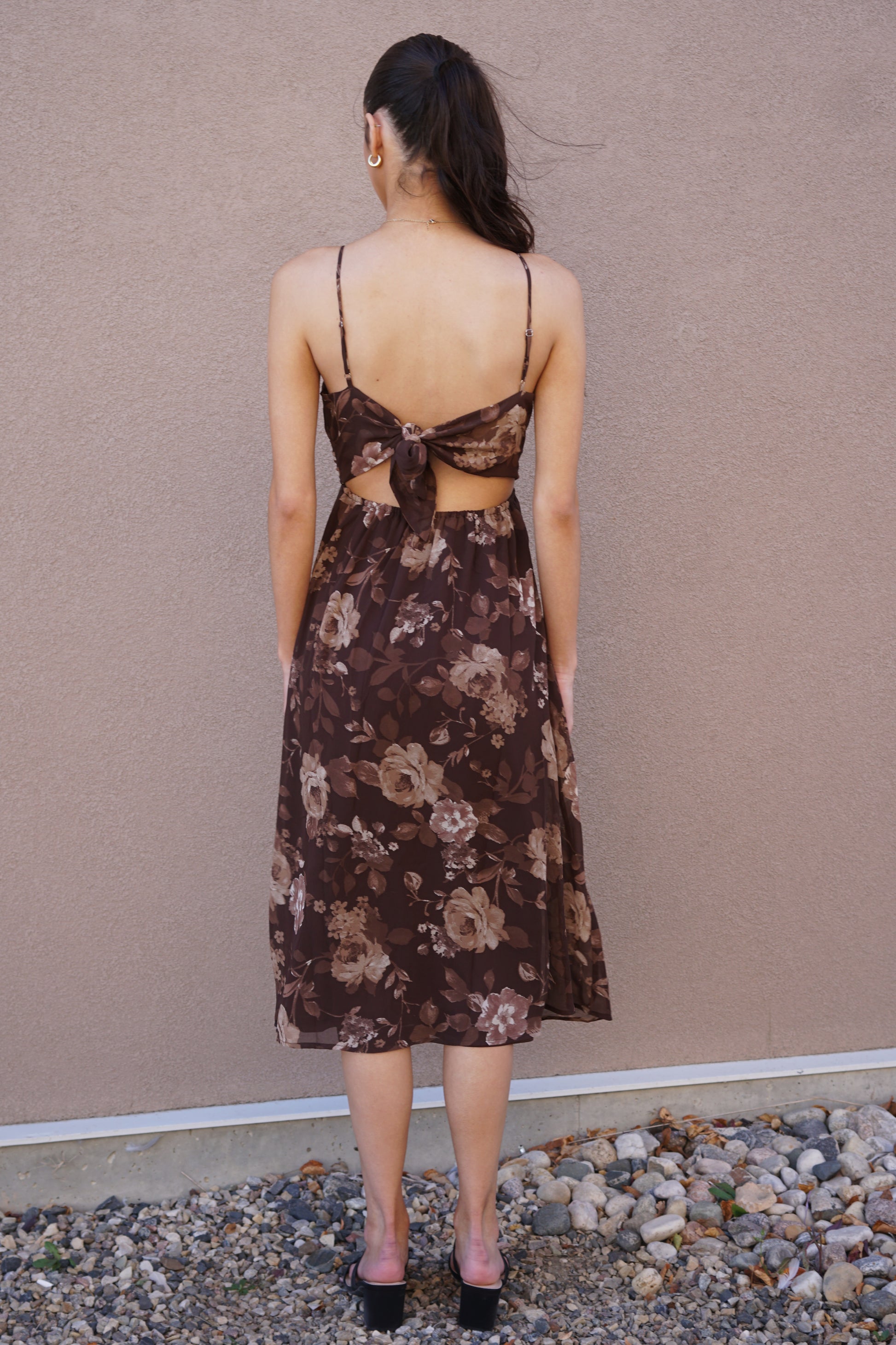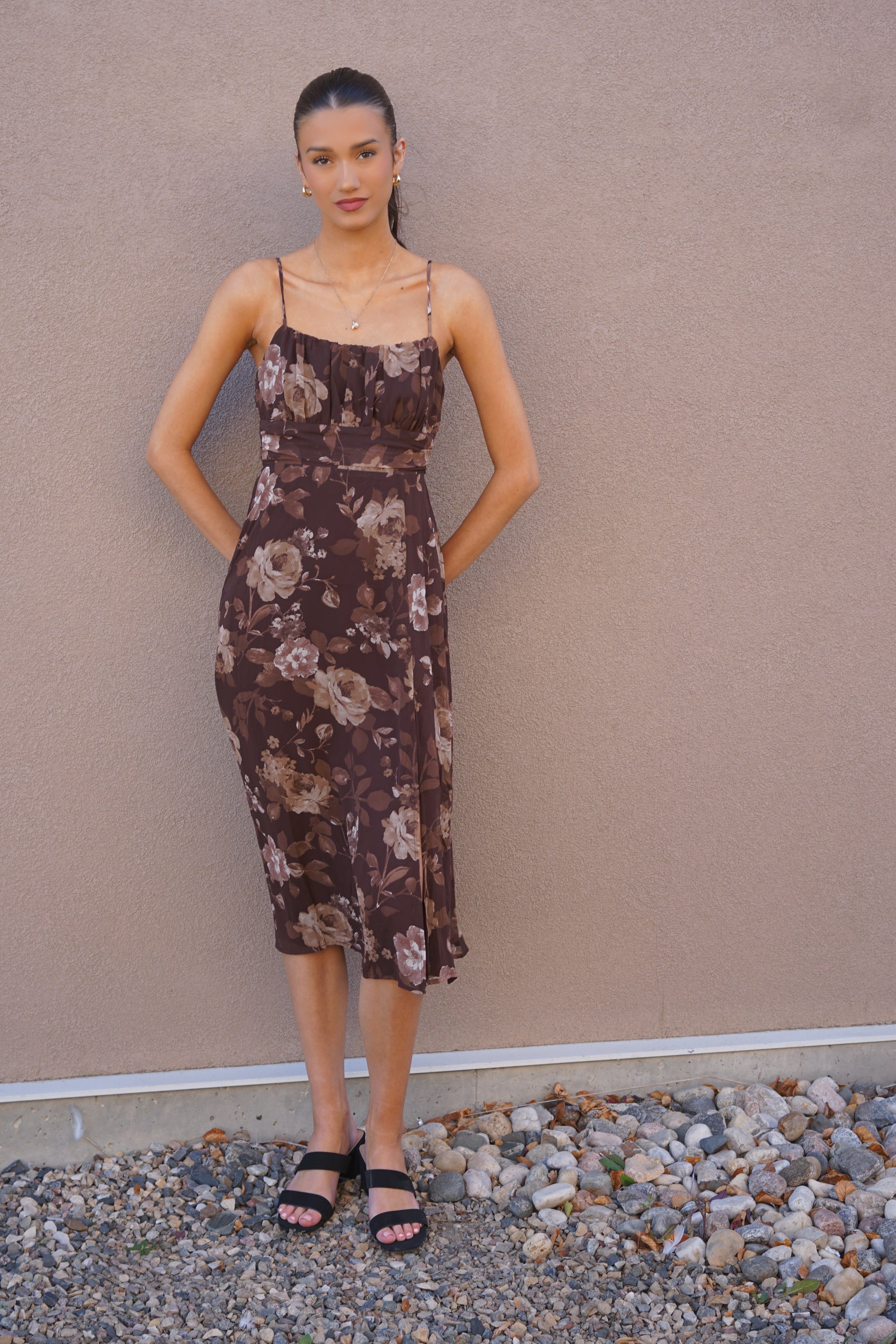 PRINT - SHIRRED BUST - ADJUSTABLE SHOULDER STRAPS - SHIRRED WAISTBAND - TIE BACK - SIDE SLIT - FULL LINING - FIT AND FLARE MIDI DRESS
