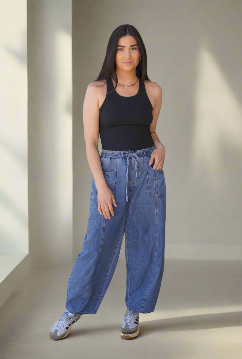 These barrel denim pants have an elastic waist and drawstring. Easy way to wear the barrel jean trend without it being overwhelming.
