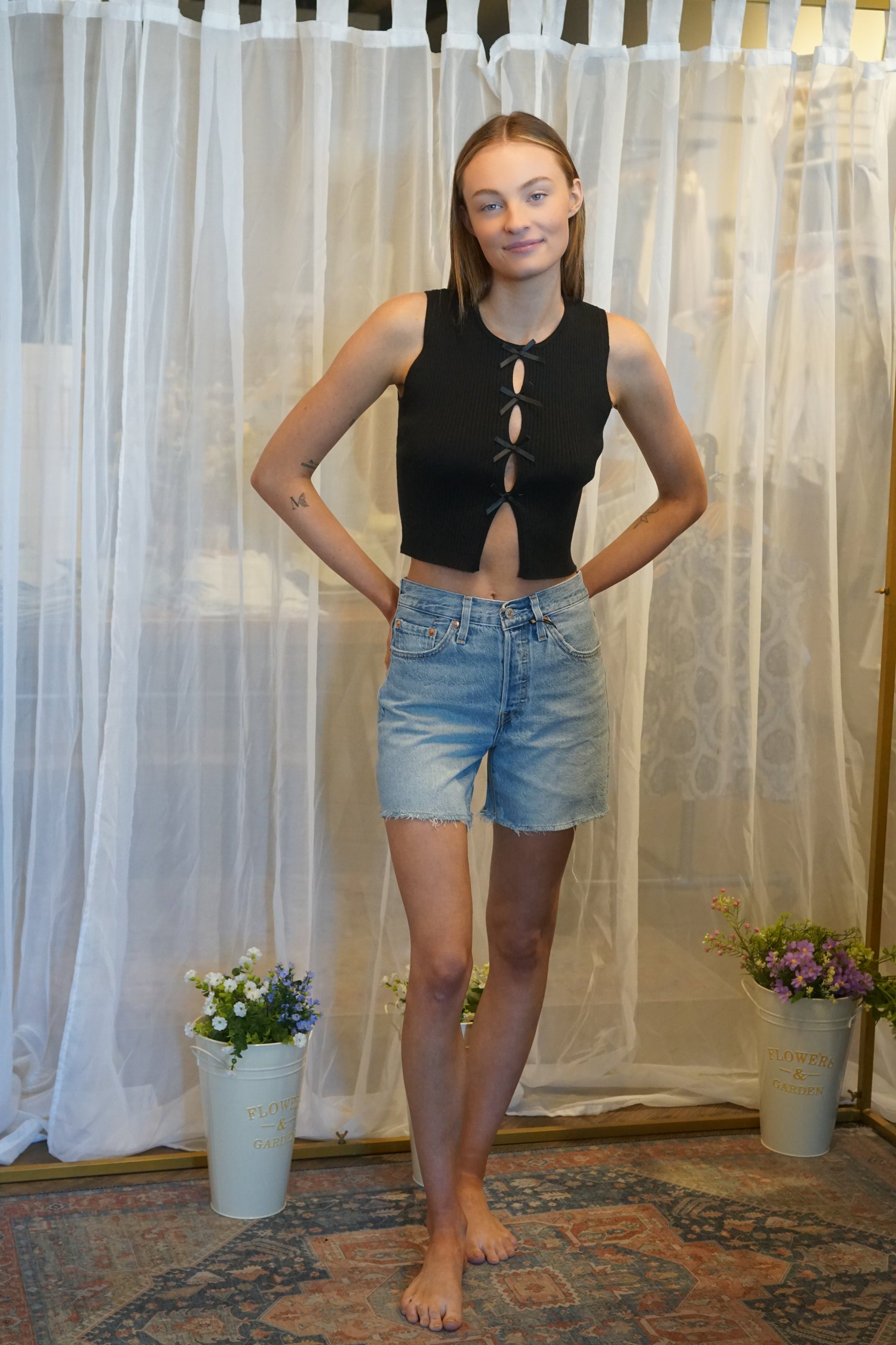 A cropped stretch little bow front top with peek-a-boo cut outs