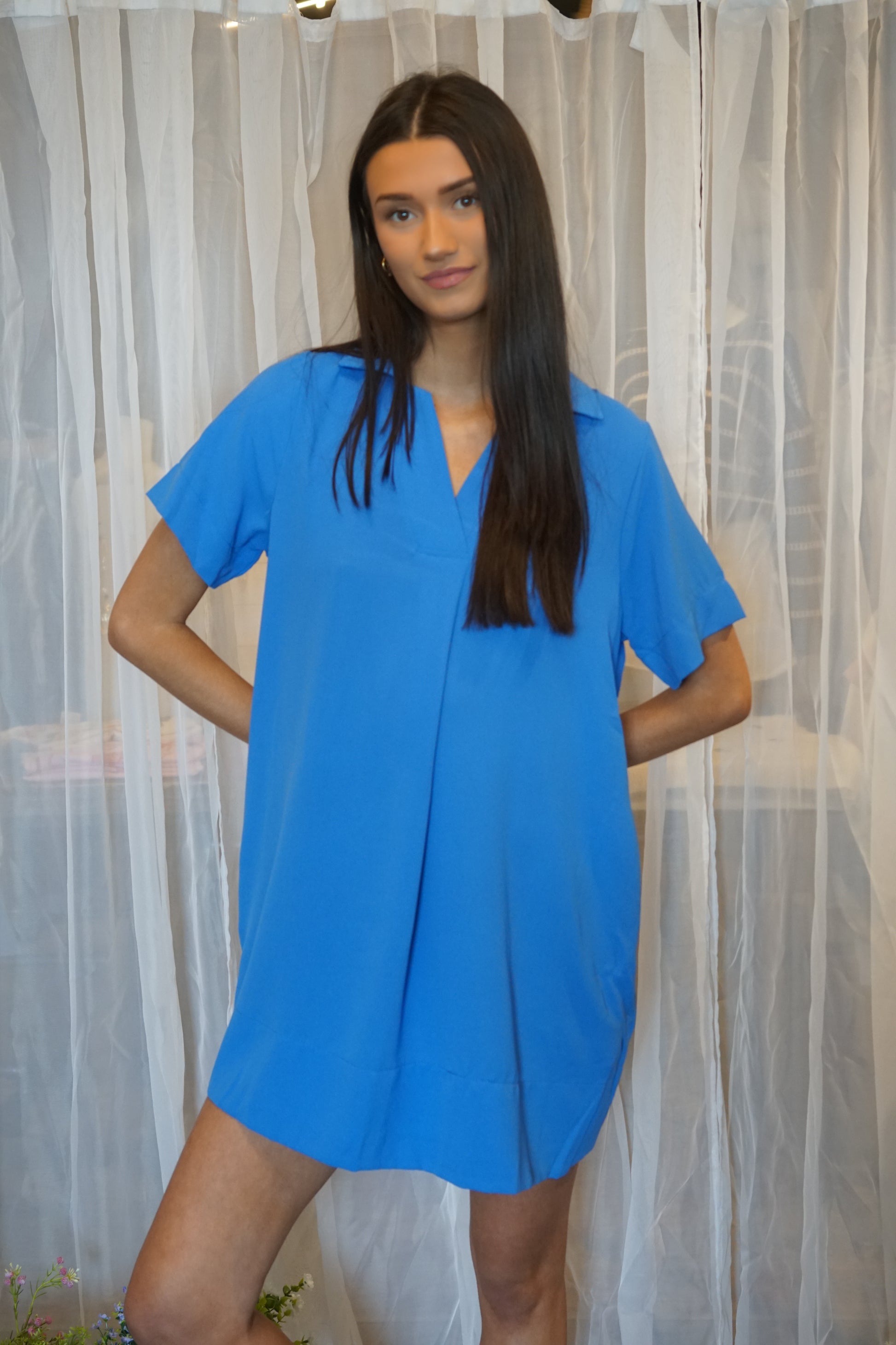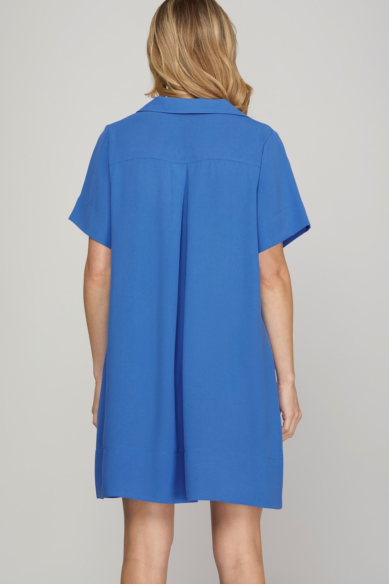 This loose cobalt blue mini dress features short sleeves, a collared neckline, and pockets! It's the perfect addition to your wardrobe.