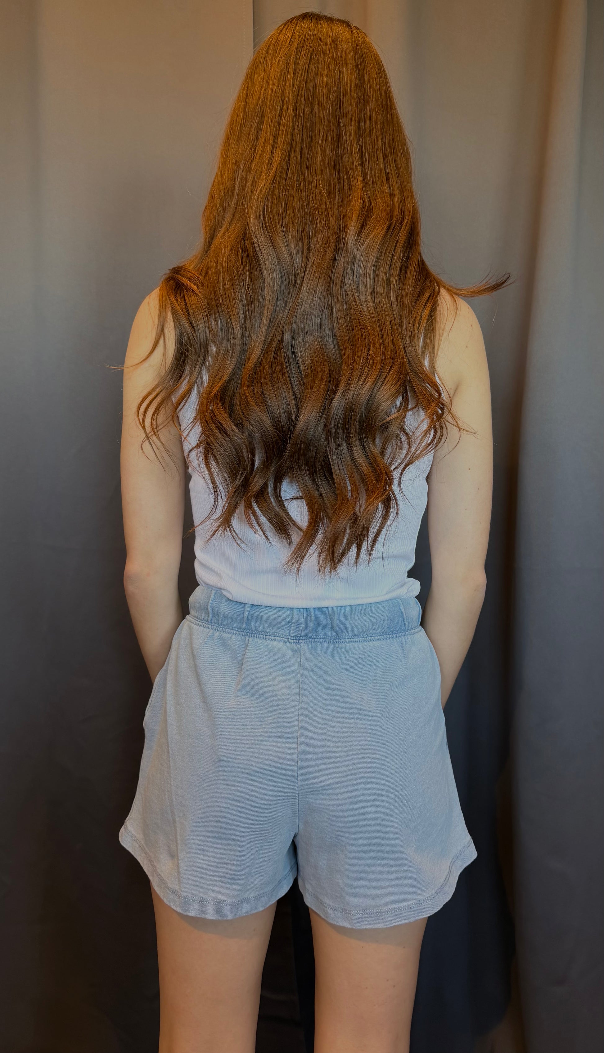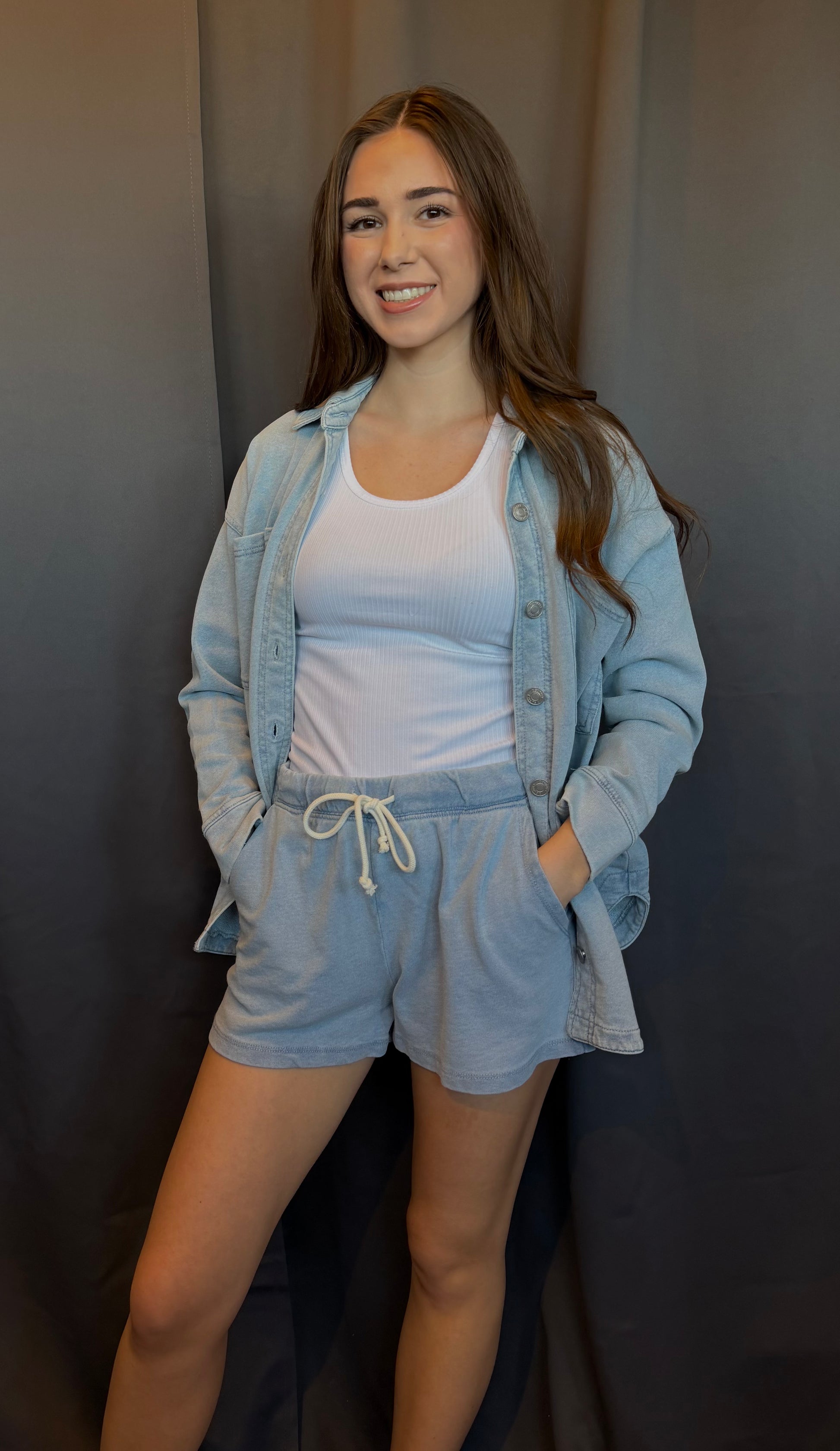 Kicked-back and cool, this knit denim French terry short has a lived-in look and feel. The contrast drawcord at the high-rise waist gives a little sporty twist, while the slash pockets keep it functional