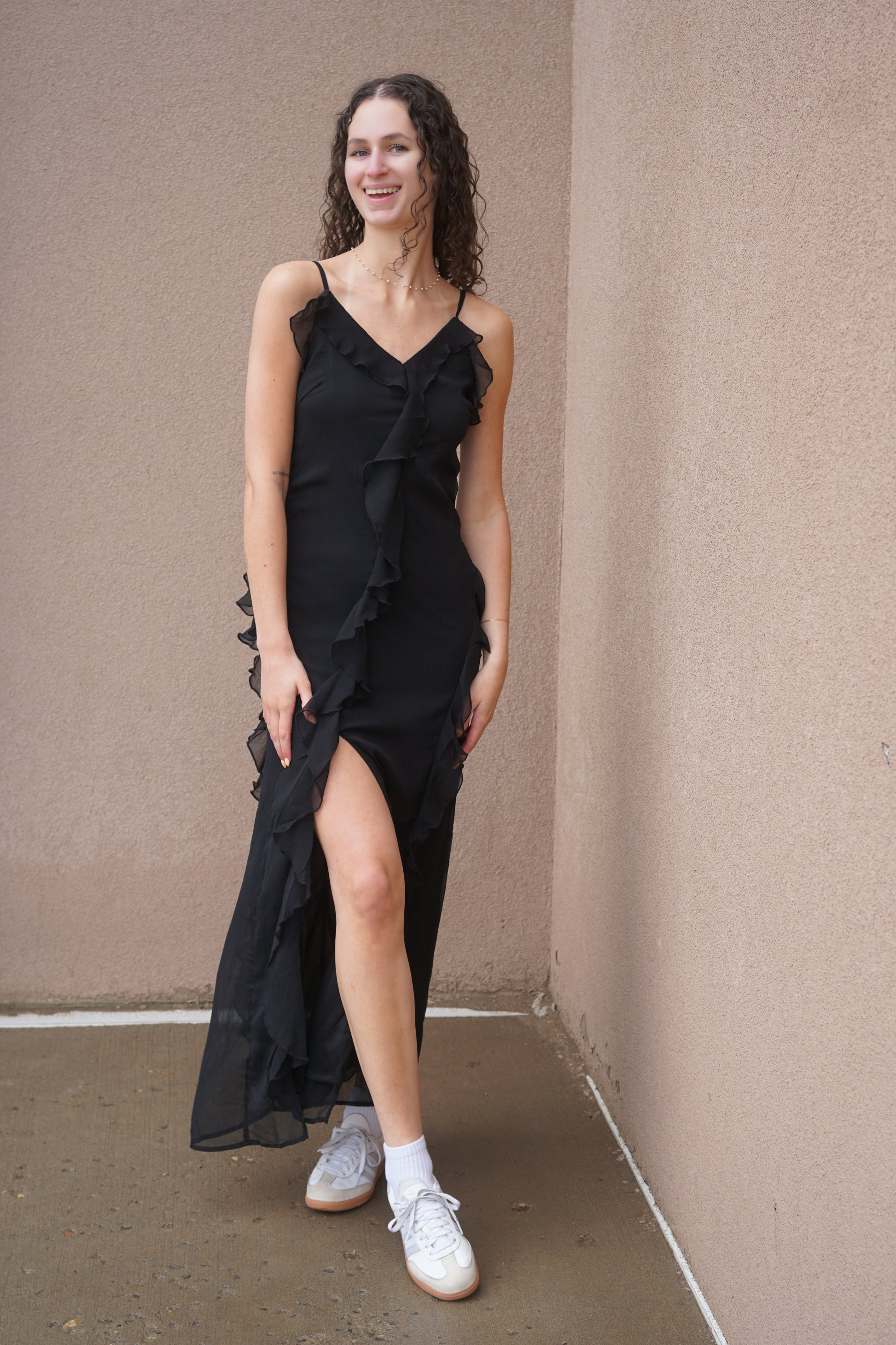 - Product Type : Dress - Neck : V-Neck - Sleeve : Sleeveless - Straps : Adjustable straps - Length/Size : Long - Extra details : Frills - Fit : Regular Fit