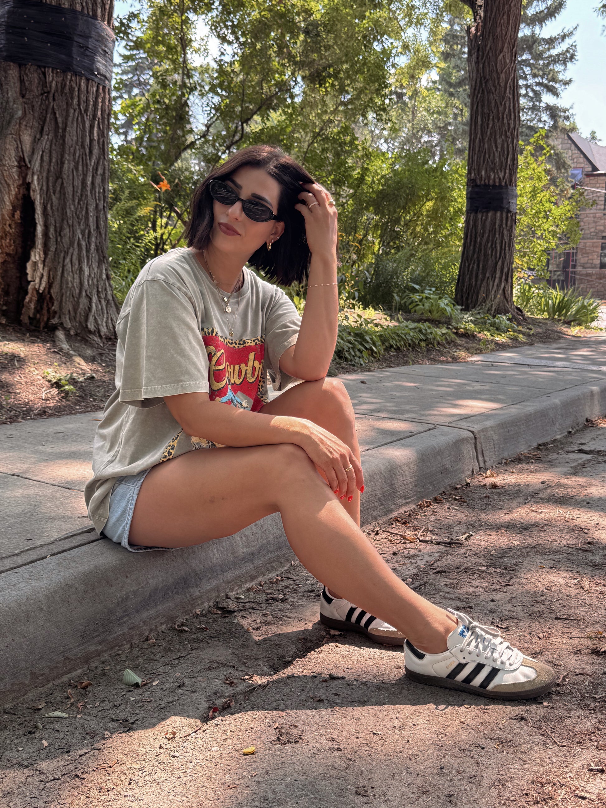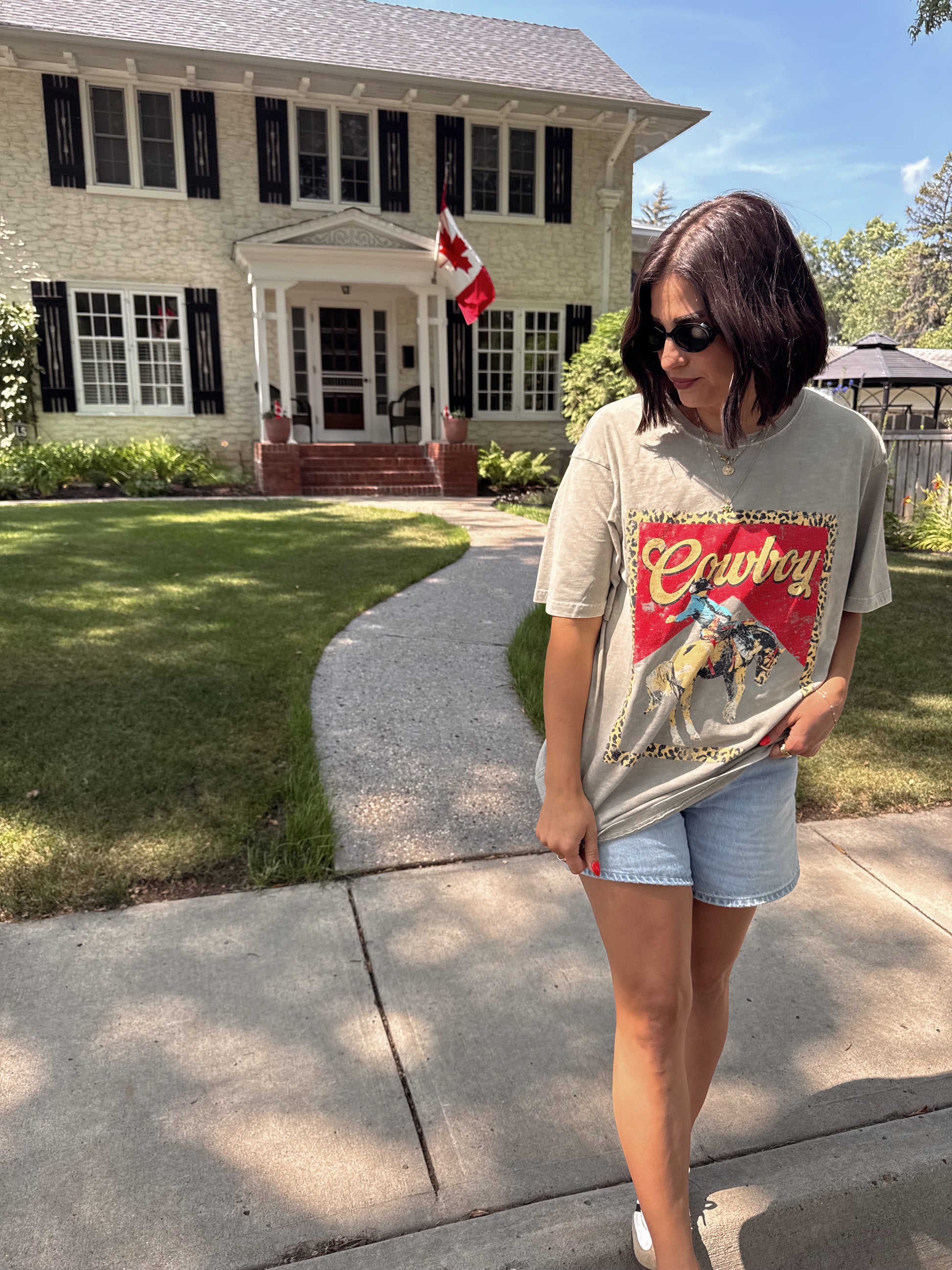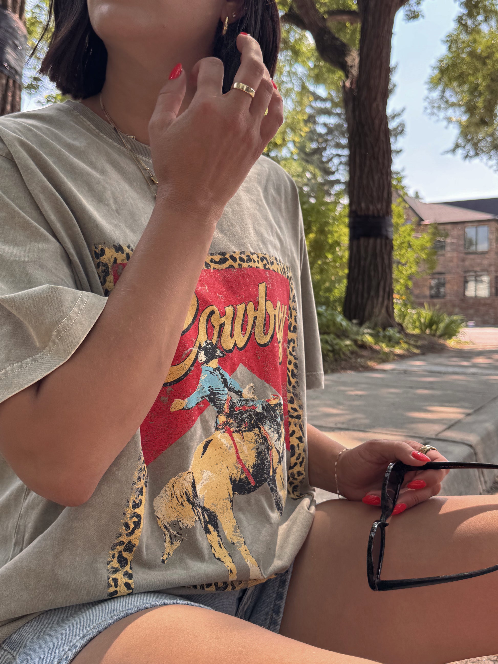 This playful tee features a vintage-inspired cowboy leopard frame graphic on soft, mineral-washed cotton. Designed with a relaxed boyfriend fit, it’s perfect for adding a fun western flair to your casual wardrobe.