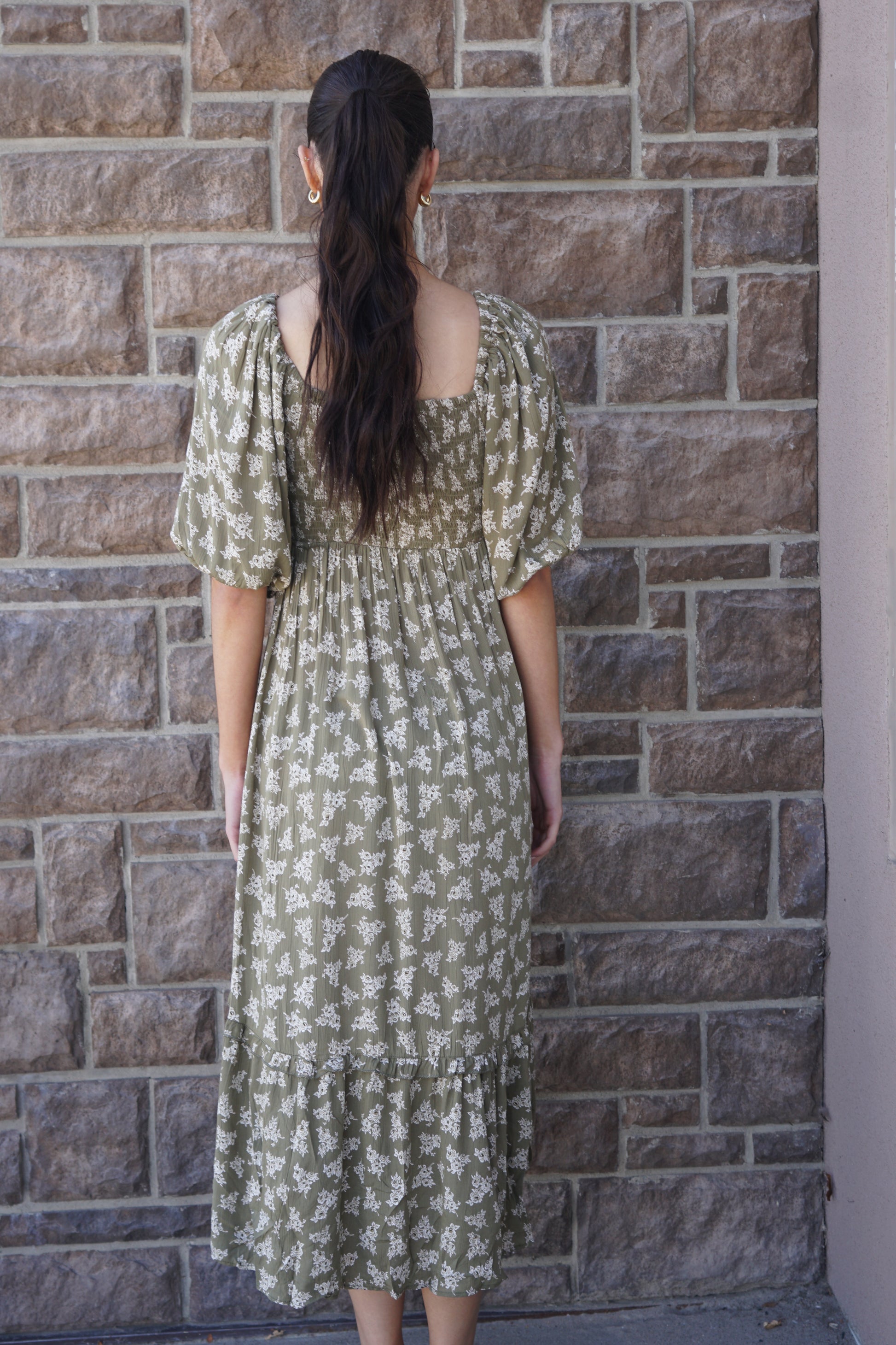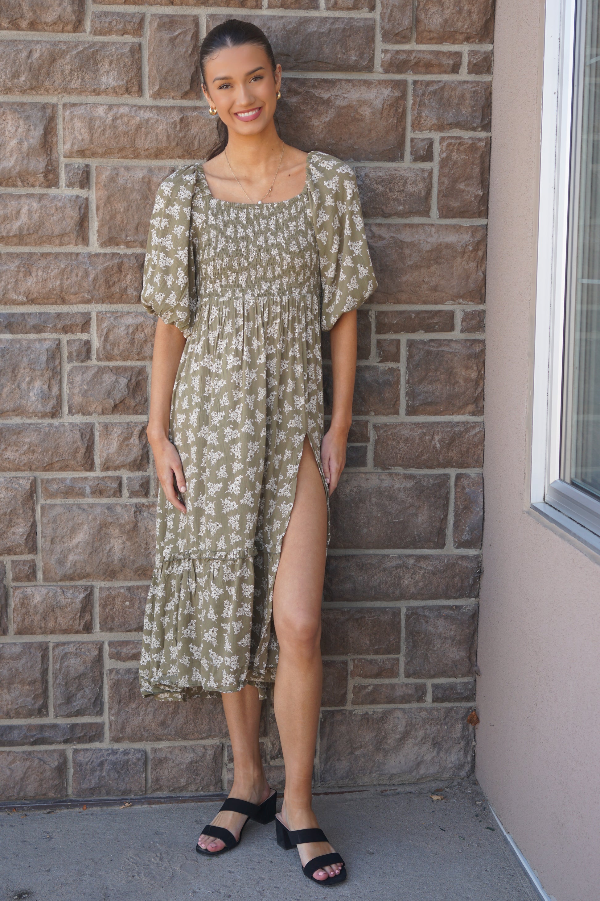 SMOCKED BODICE HALF SLEEVE MIDI DRESS W SIDE SLIT