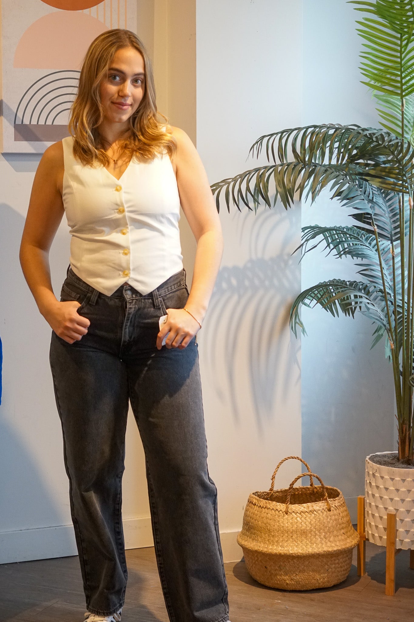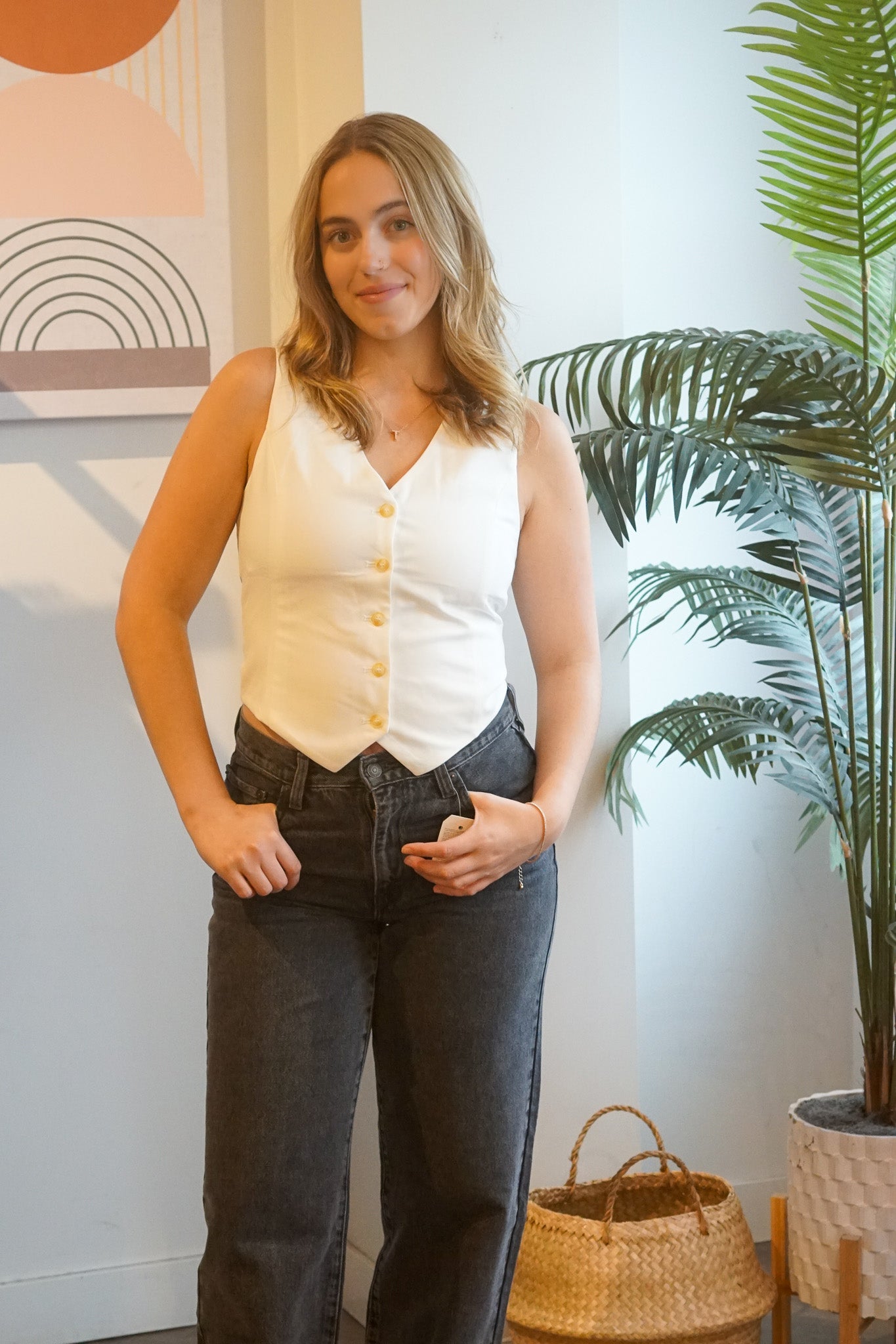 A revamped version of a tailored vest! This sleeveless vest in a classic solid design showcases a V neckline, a 5-button front closure, a pointed front hem, and a regular-length fit to ensure it's not overly cropped - making it a timeless wardrobe staple. Model is 5'8" 33-24-35 wearing a size Small.