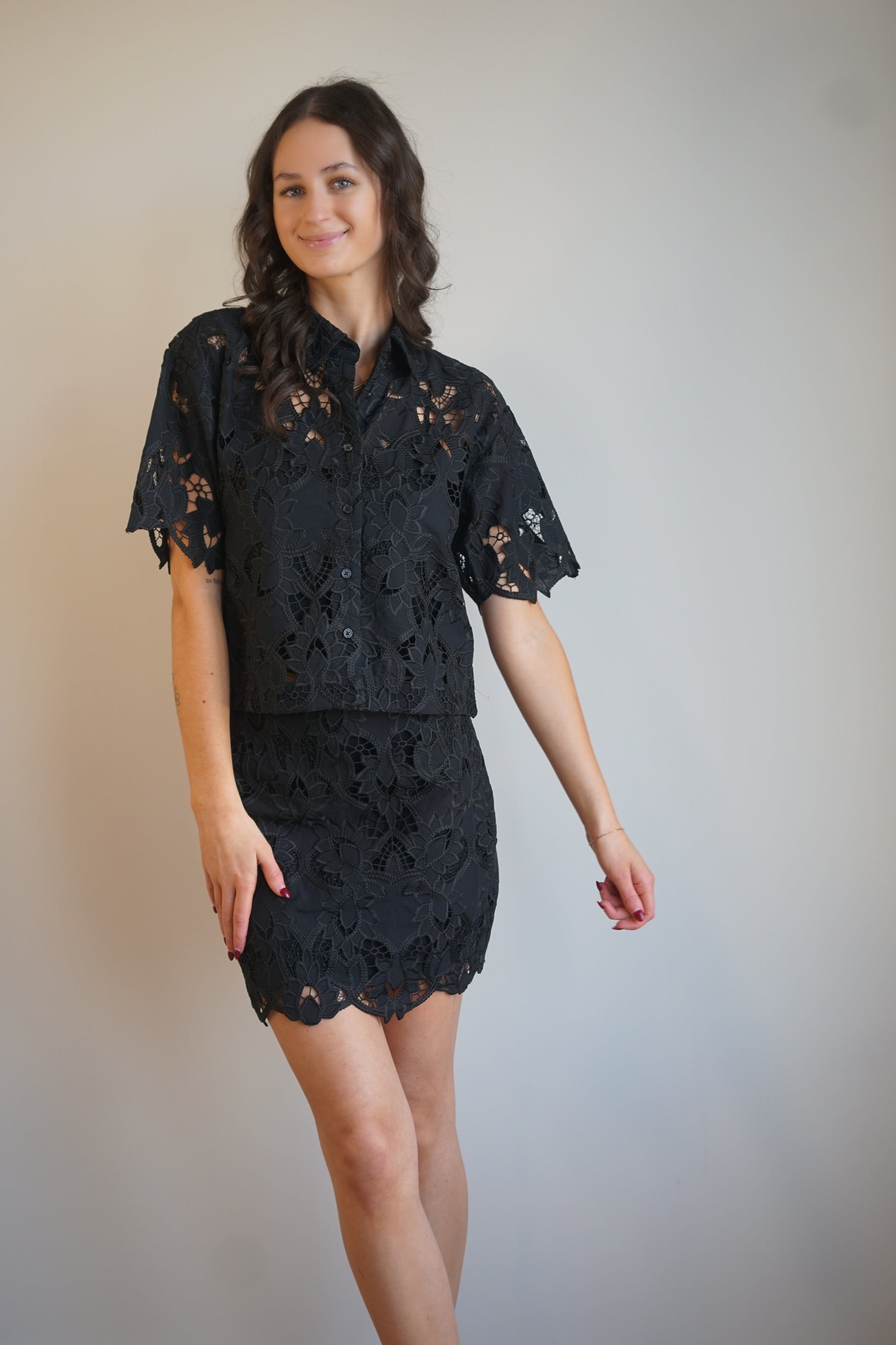 This high-rise mini brings an elevated lace texture to your look. Its delicate finish and hidden zip closure make it the kind of piece that feels as effortless with a tucked-in blouse as it does with a casual tee.