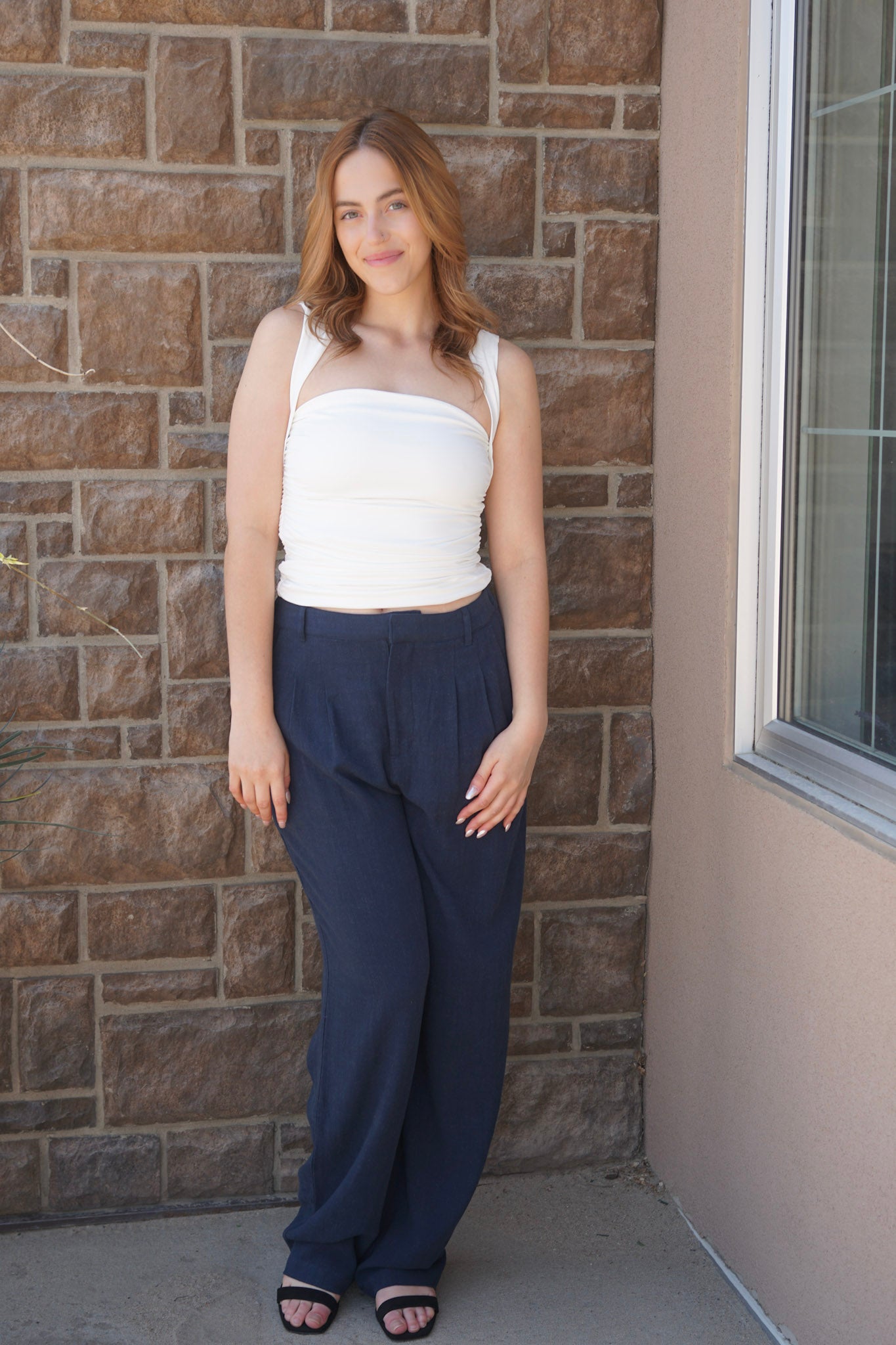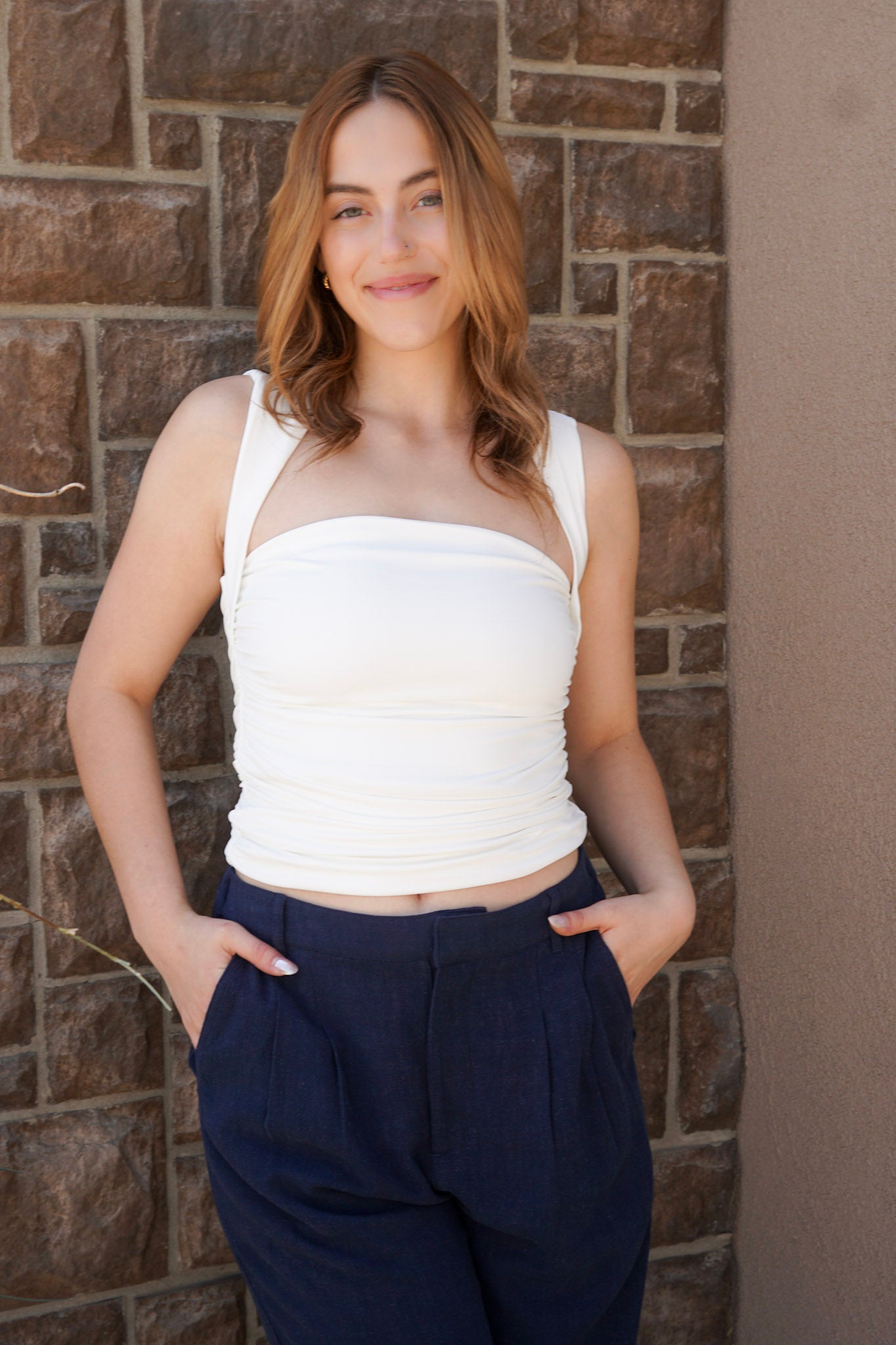 A contour florish top double lined. Ruched side, fitted rounded square neckline.
