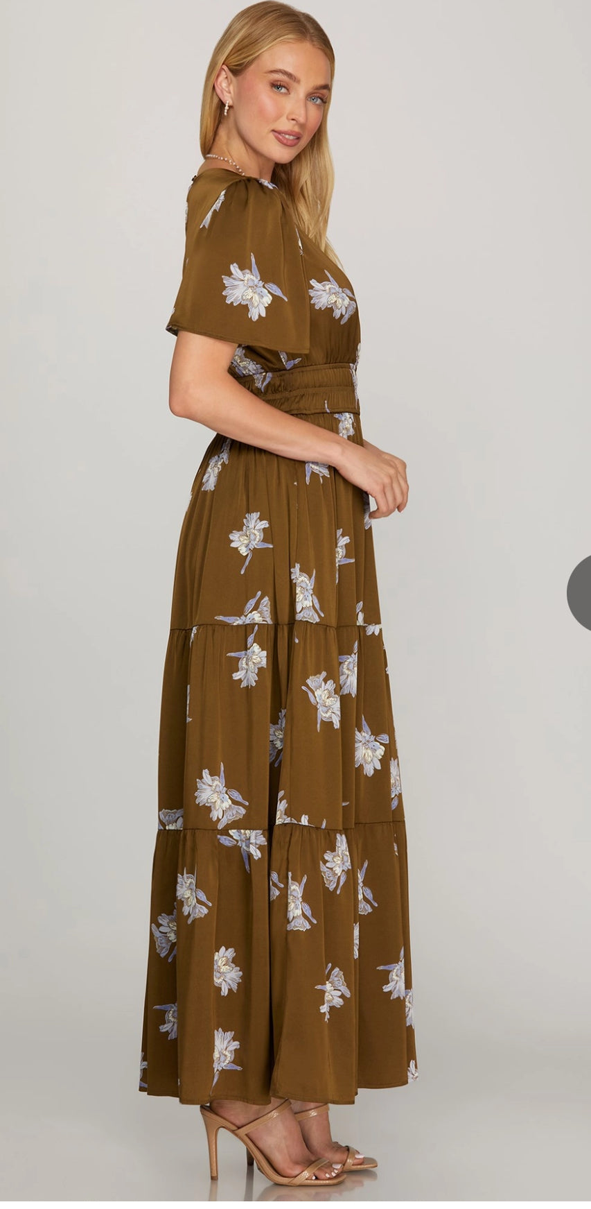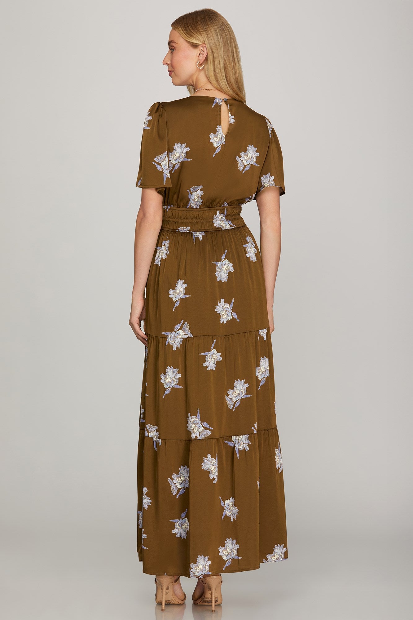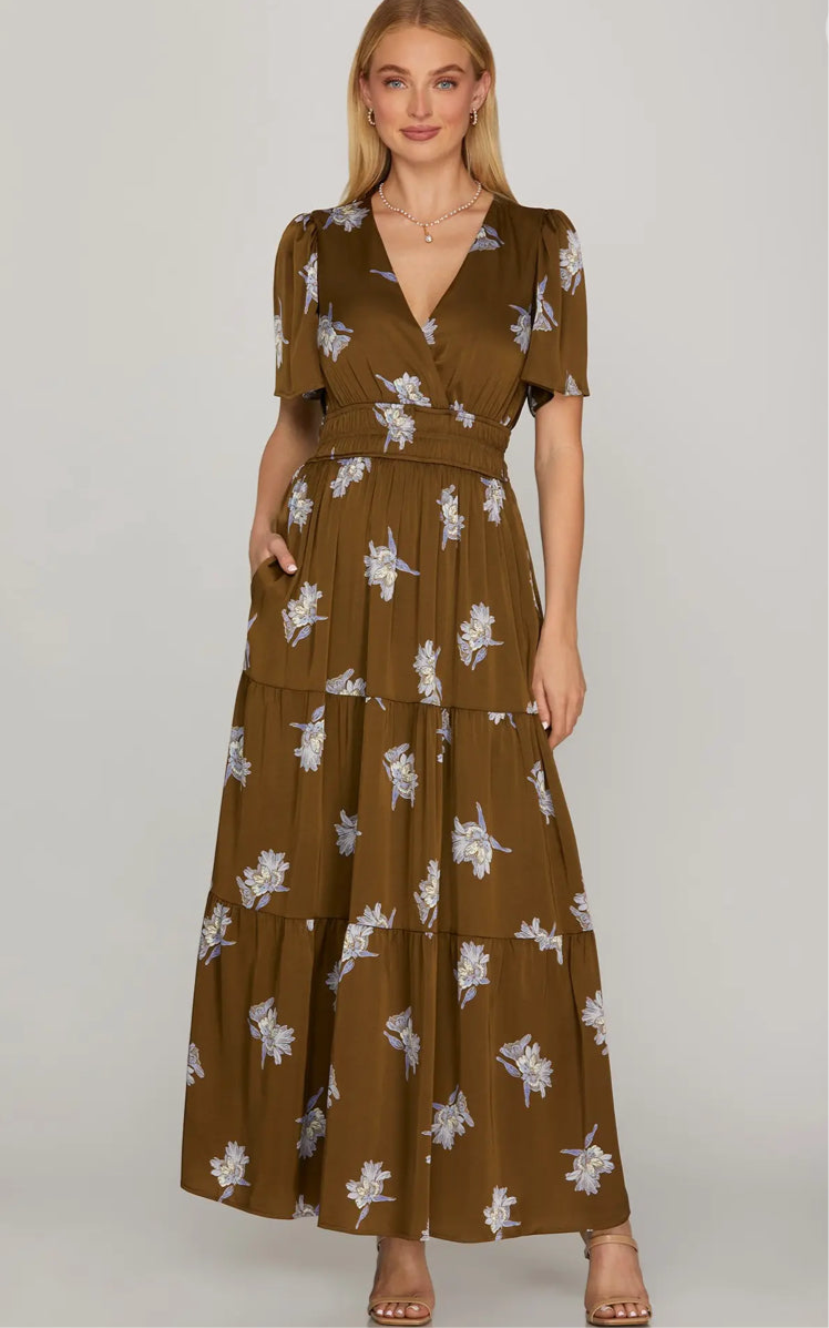 This beautiful maxi dress features a half sleeve surplice neckline with a floral satin print. Designed with a tiered skirt, it includes an elastic waistband for a comfortable fit and convenient pockets for added practicality.