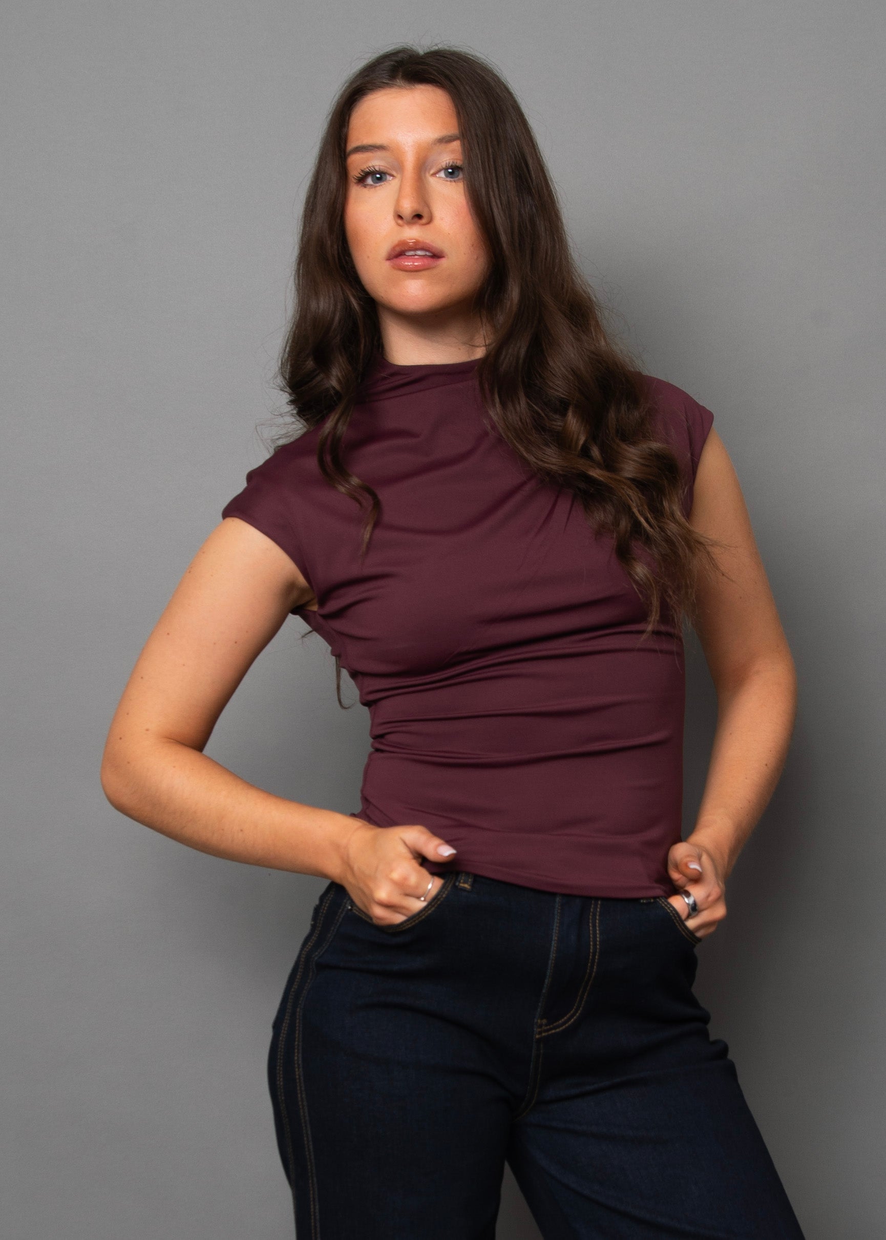 Funnel neck ruched top in prune